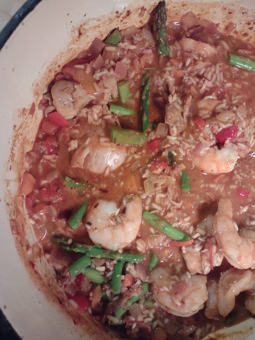 First find: Portuguese Paella. (See the top photo). We had some family friends coming over, so once I got the okay to make shrimp, I made my grocery list. I did leave out the peas and I absolutely couldn’t find saffron anywhere. I substituted some turmeric. Obviously, I haven’t had this dish both ways, but I can say the turmeric didn’t ruin it. It was so good that I was given permission to make it again. I did make sure to chop all the veggies before our guests arrived, so when the time came to cook, it was easy to visit the kitchen to add the next ingredient to the pot and pop out in between timers to visit.